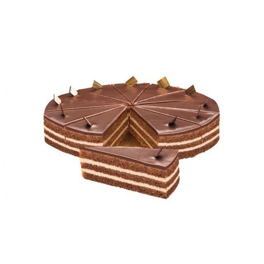 Торт «Прага».В основе верхнего слоя используется бельгийский шоколад, а не глазурь. Основу торта составляют три слоя воздушного французского шоколадного бисквита, тщательно пропитанного абрикосовым конфитюром, на которые наносятся два слоя натурального масляного крема с какао. Все вместе дополняется сверху ганашем из 70% темного шоколада. Готовый к употреблению продукт.Вес 1600 гр. Разморозить при комнатной температуре 2-3 часа.